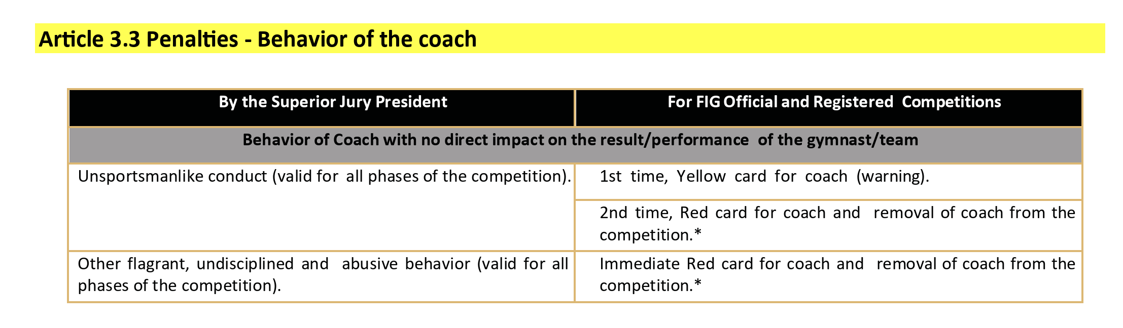 What makes this policy unique is that yellow and red cards are only given to coaches, not gymnasts. Coaches are subject to these penalties, while gymnasts receive different consequences for similar actions.