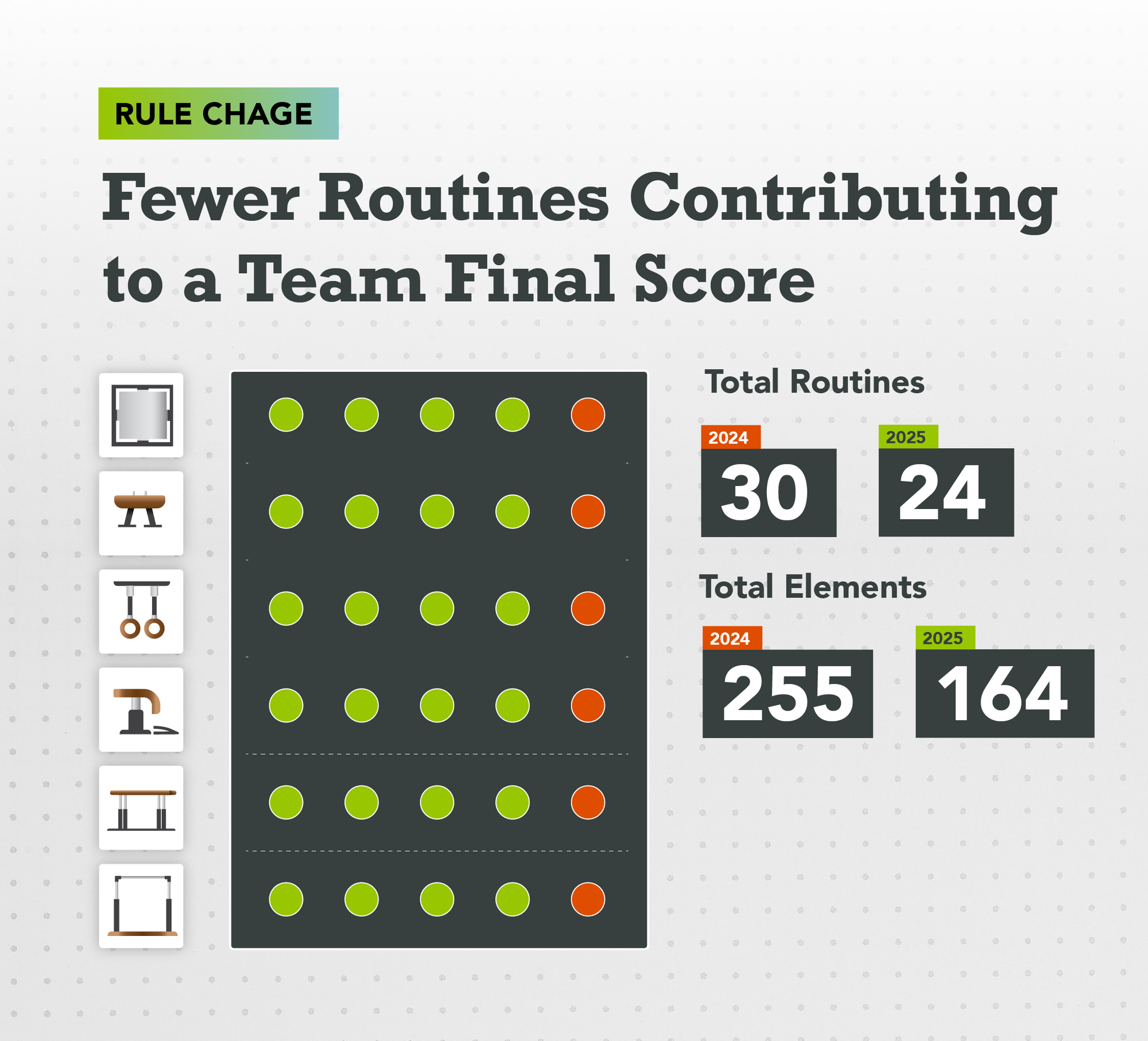 Arguably, the most significant rule change for 2025 was the reduction of the number of counting routines per event from five to four, cutting six routines from each meet. Meaning, the total number of counted skills for a team's final score dropped to 164, a reduction of 91 skills.