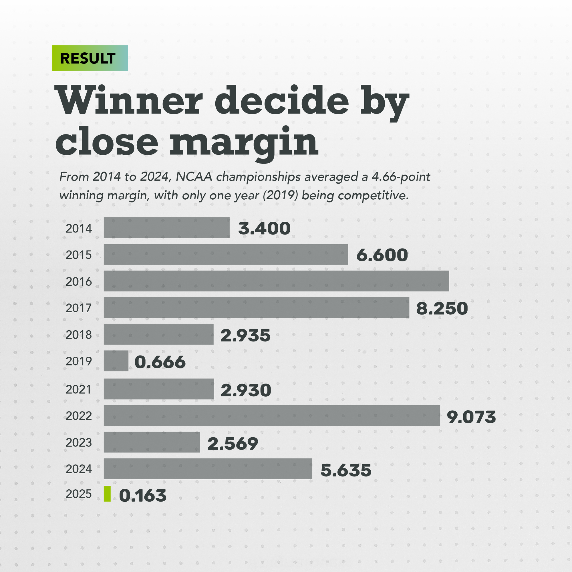 NCAA men’s gymnastics is facing serious challenges, most notably the steady decline in collegiate programs as more schools eliminate their teams. Yet, a less frequently discussed issue is the growing perception that NCAA competitions have become somewhat stale and lacking excitement. Until 2025, large point margins often decided NCAA championship titles. From 2012 to 2024, the top two teams averaged a 4.66-point difference, and in 2016 and 2022, the margin exceeded 9 points. To put this into perspective, a single fall deducts just one point, so in these competitions, the winner was basically determined well before the final rotations even started.