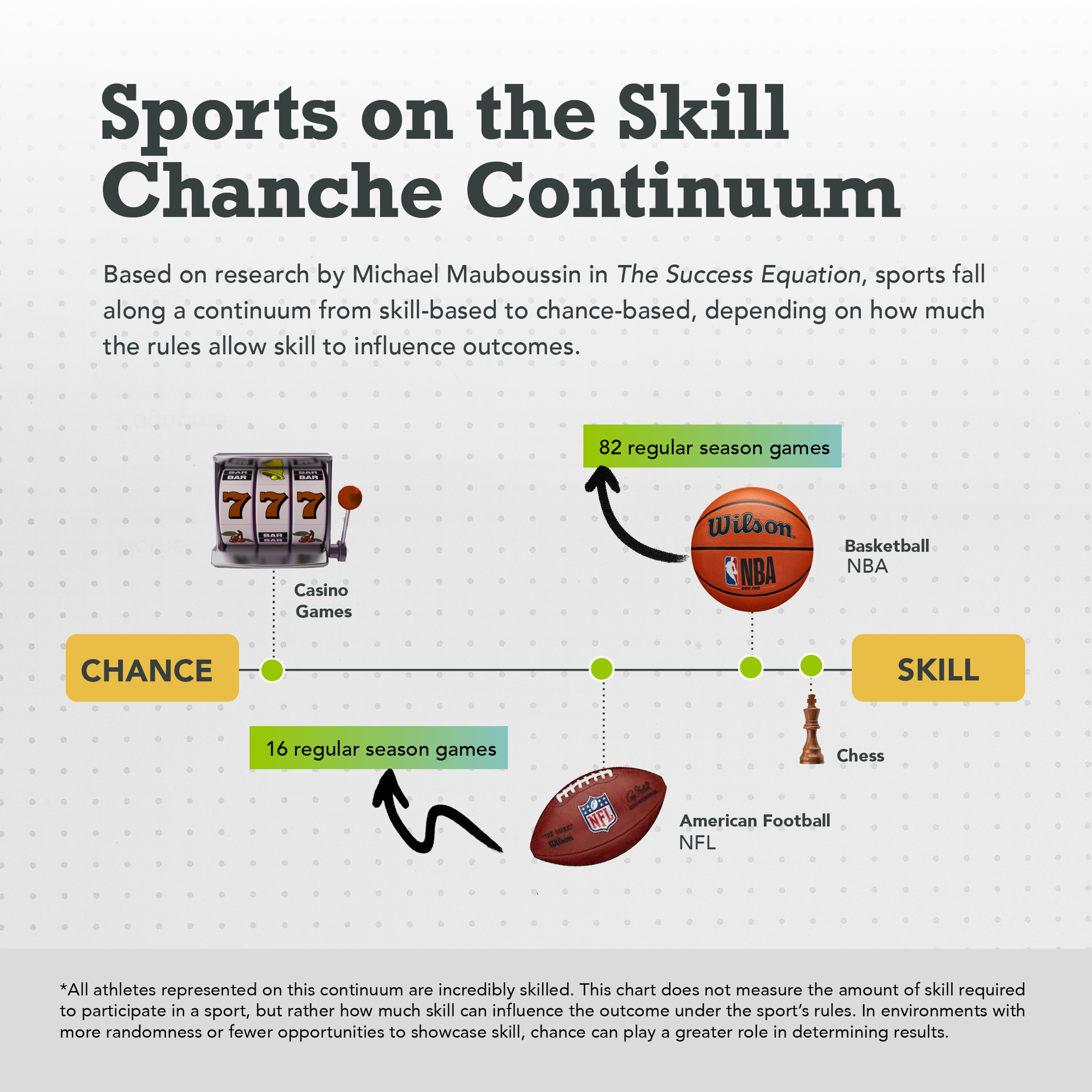As a result, finals scores became closer and the gap between teams shrank, creating a more competitive environment. This outcome is grounded in basic statistics: the more routines and skills that contribute to the data set (the team’s total score), the more closely the average score captures a team’s “true performance ability”. When there are fewer routines and skills, outlier scores, such as a fall or an unusually stellar routine, have a bigger effect on the team total. This greater variability was evident in 2025 when the top two teams lost 30% of their meets.This idea reflects Michael Mauboussin’s concept from The Success Equation, which examines the balance between luck and skill in sports. Mauboussin contends that variability, the unpredictability of outcomes, is central to the excitement of sports, but it also means the “best” team doesn’t always come out on top. He places sports on a spectrum: at one end, luck (or unpredictability) and on the other, skill. The NBA’s long 82-game season builds a large dataset, allowing teams’ true performance ability to emerge over time, while the NFL’s shorter 16-game season leaves more to chance, resulting in more frequent upsets.
